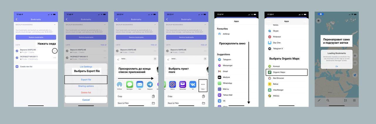 כדי לייבא סימניות מ-MapsMe ומאפליקציות אחרות התומכות ב-KML/KMZ באנדרואיד, פתח את תפריט הסימניות בסרגל הכלים התחתון ולחץ על כפתור הייבוא. ייבוא אוטומטי מ-iOS אינו אפשרי מבחינה טכנית, ולכן הנה מדריך קצר